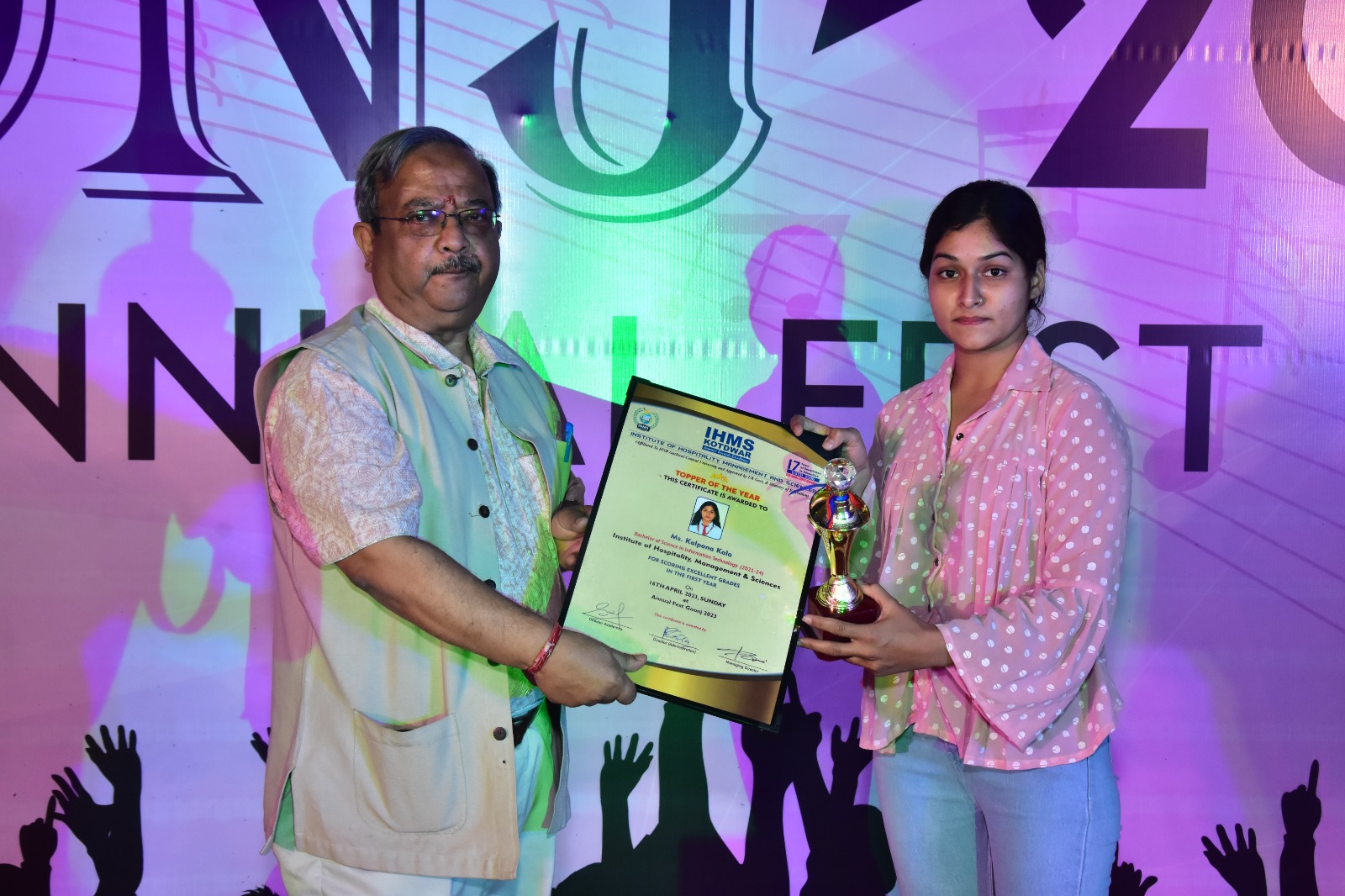 The vibrant and scintillating performance of the students enthralled everyone. This program has also been appreciated by the parents of the girl students. Many students received awards like Student of the Year (Ms. Khushi Gusain), Staff of the Year (Mr. Chandra Ballabh Bahukhandi), and Topper of the Year. In the end, the chief guest wished all the students a happy and prosperous future. The program was hosted by HoD Hotel Management and concluded with a Vote of Thanks by the Cultural Committee Chairman.